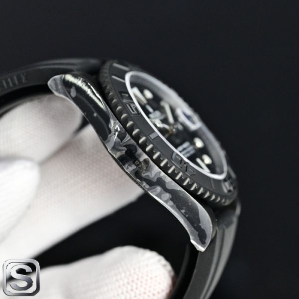 Rolex crown logo micro etched at 6 o'clock on the crystal.