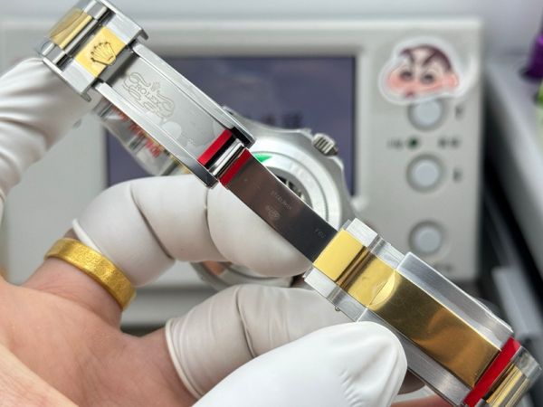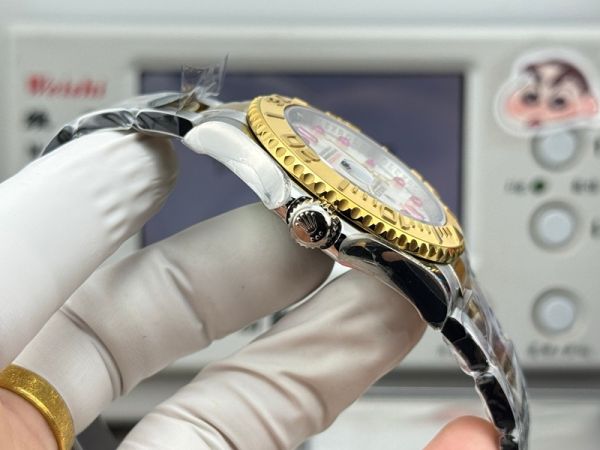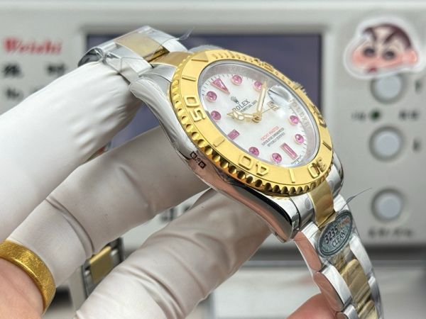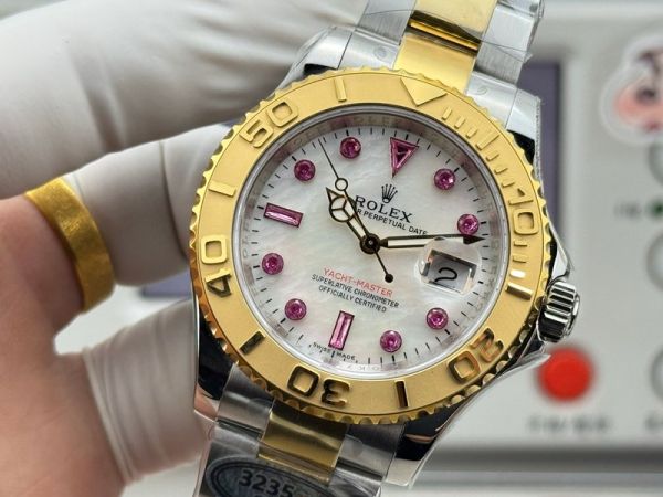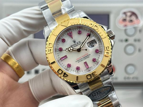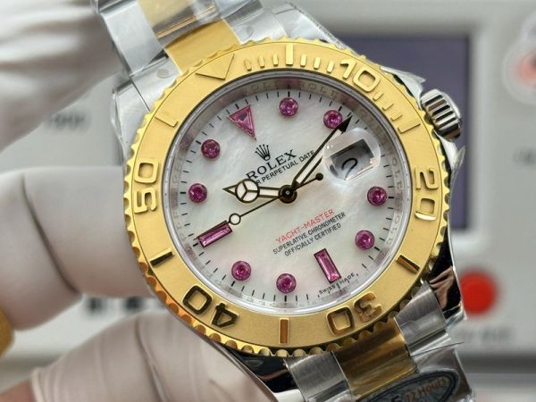 Rolex Yacht-Master 168623, crafted from two-tone material (stainless steel + 18K yellow gold), features a white mother-of-pearl dial paired with ruby hour markers, exuding ultimate luxury and elegance.