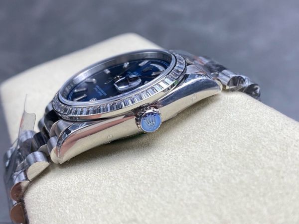 8+ Factory ROLEX Day-Date Replica with Diamond Bezel 36mm Baguette Markers Blue Dial Watch