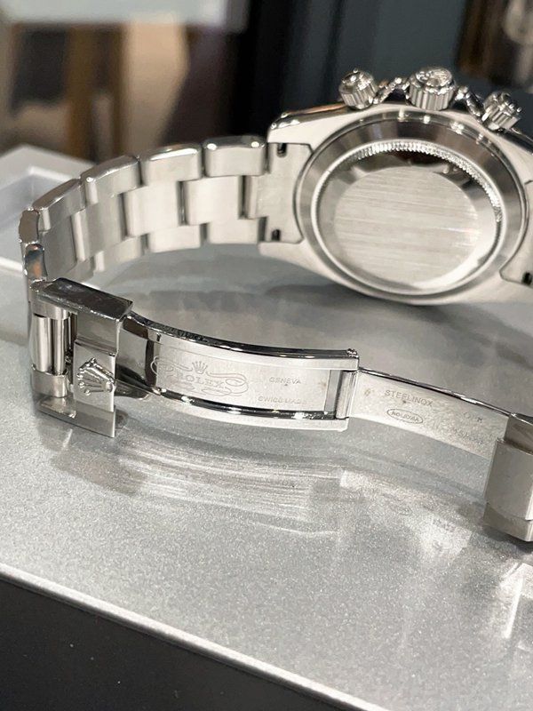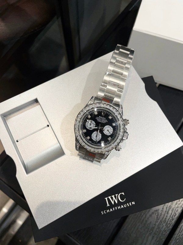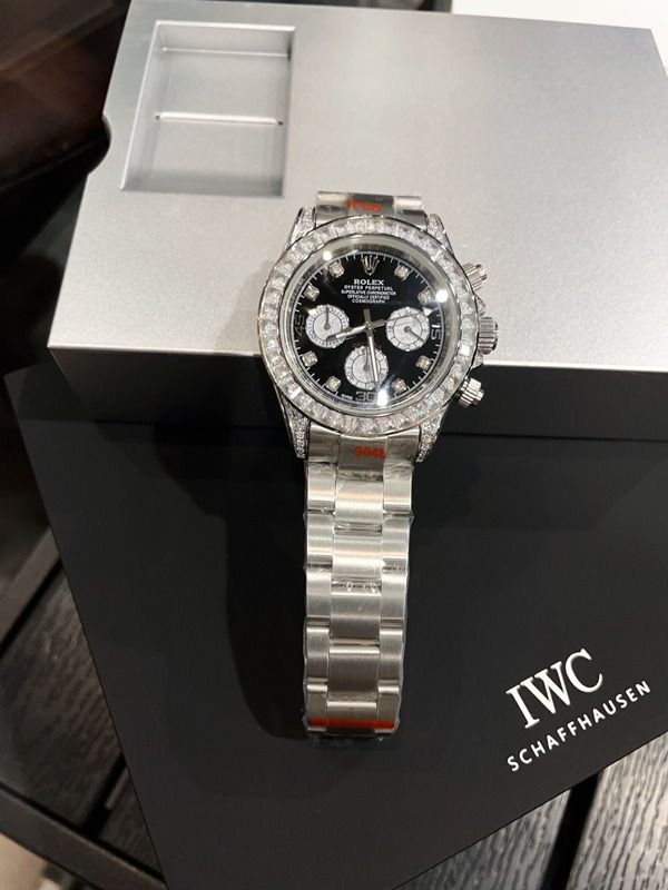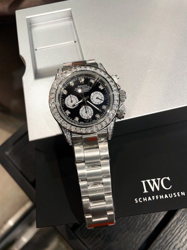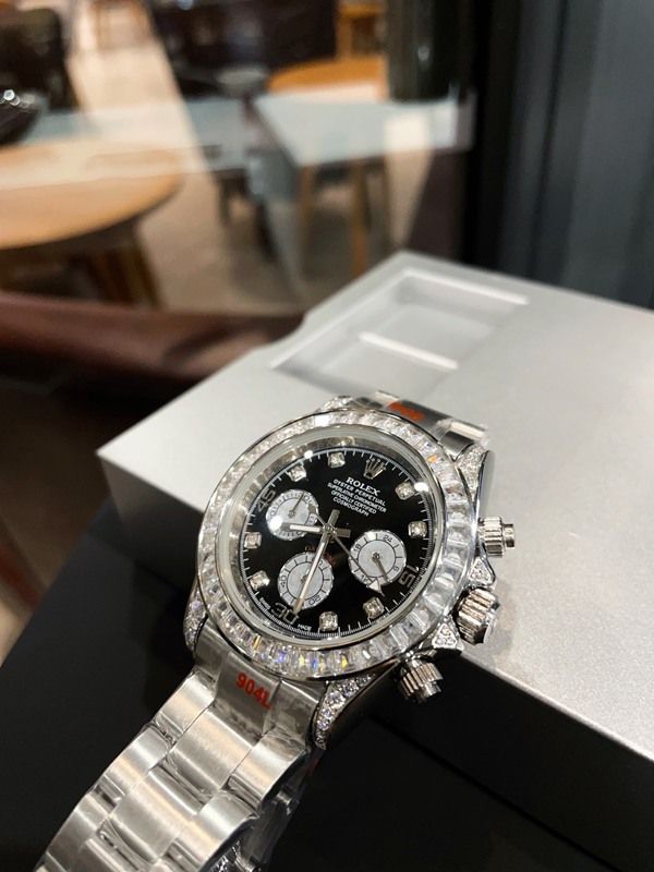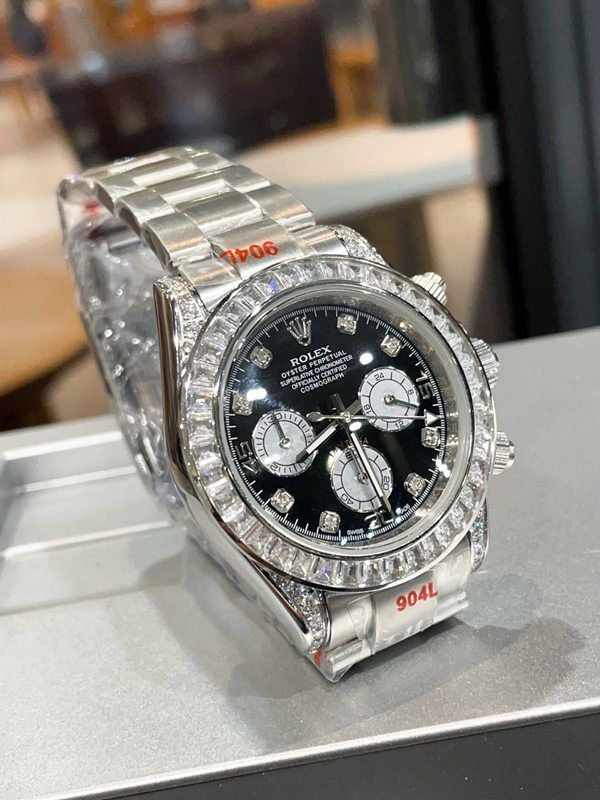 Rolex Cosmograph Daytona 126579RBR, made of 18K white gold, features a black mother-of-pearl dial and a diamond-set bezel, exuding luxurious charm . It has a case diameter of 40mm and is equipped with the quartz movement, which has excellent anti-magnetic performance and ensures precise timing . The Oyster bracelet with a folding clasp allows for a water resistance of up to 100 meters, making it suitable for daily wear or light diving. The black and white panda dial paired with diamond hour markers creates a sense of hierarchy, making it easy to handle both commuting and evening events, fully demonstrating high-end taste.