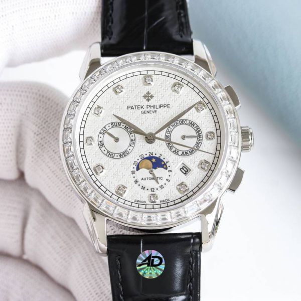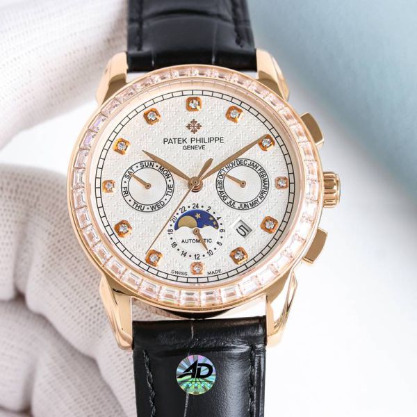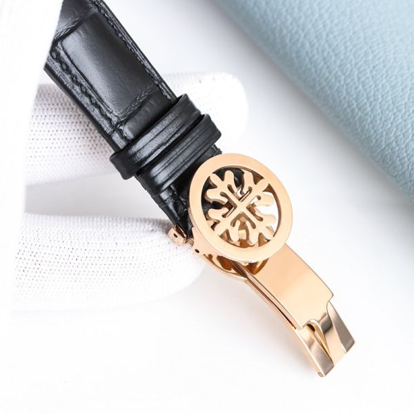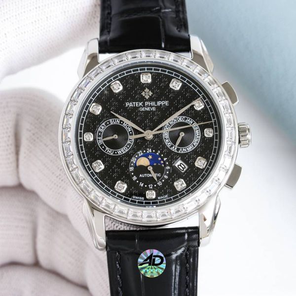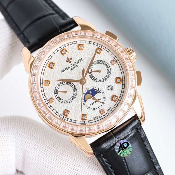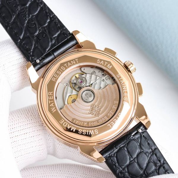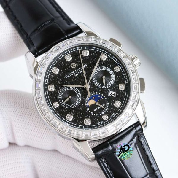 Best Edition With Swiss 9100 Automatic Movement Patek Philippe Year Month Complications Black Italian Calfskin Leather Strap Watch