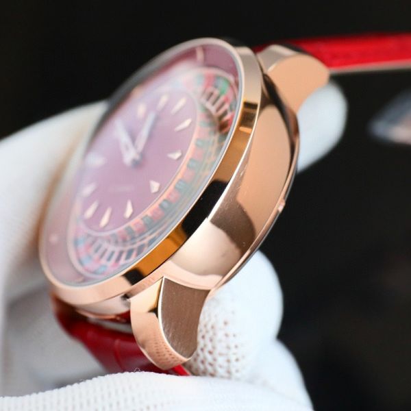 BEZEL: Rose Gold Steel Case bezel with white numbers in black and red