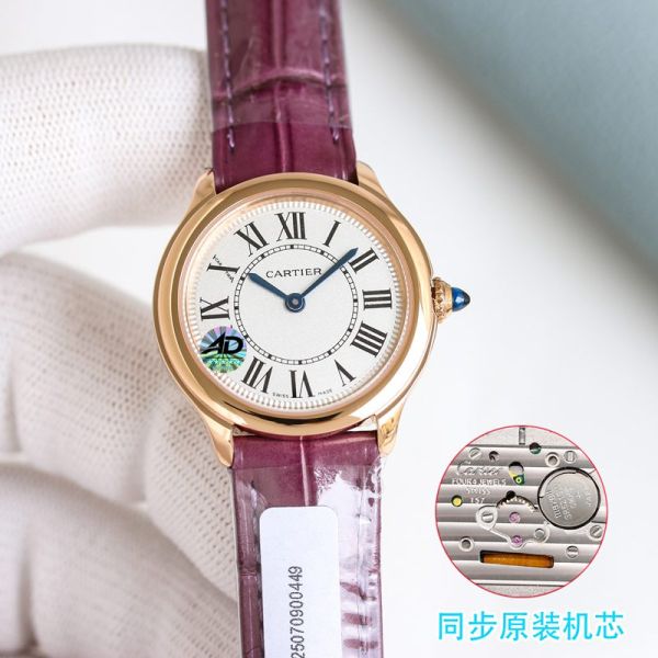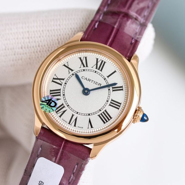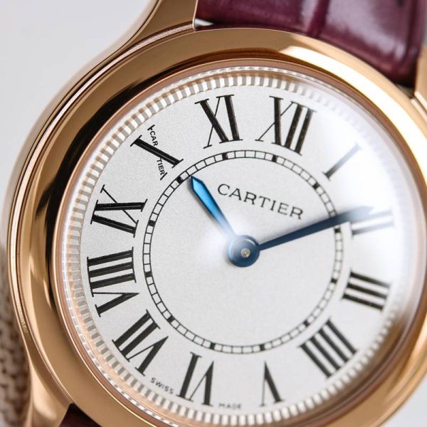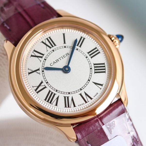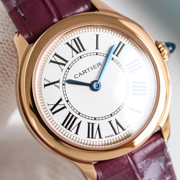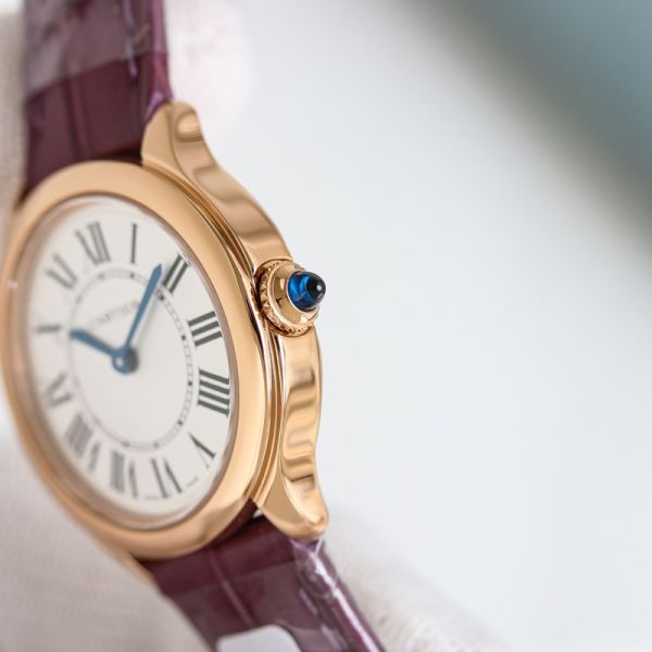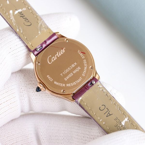 Cartier Ronde de Cartier Mini Rose Gold Watch, featuring a 29 mm dial, crafted from 18K rose gold and paired with a purple alligator leather strap, is elegant and exquisite.