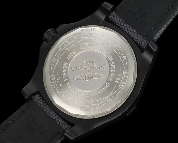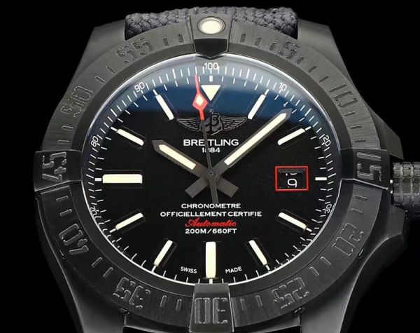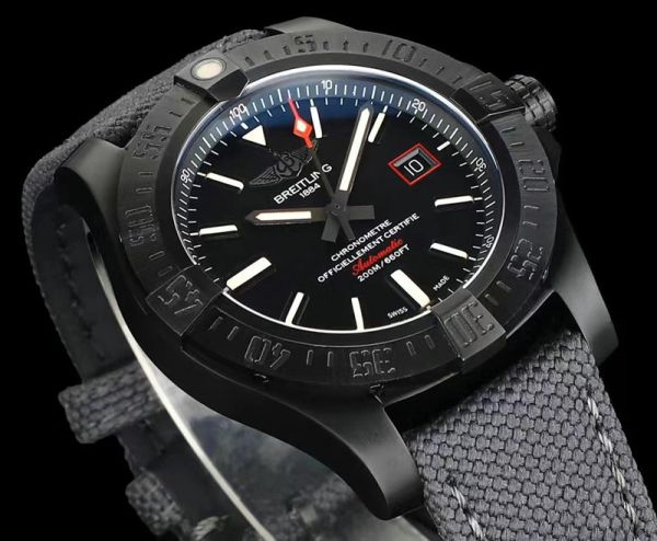 Breitling Avenger Blackbird Watch, featuring a 44mm black titanium case that is lightweight yet robust. With a carbonitrided finish, the timepiece boasts an ultra-cool matte black texture! The dial is coated with luminous material, allowing for easy time reading even in low light.