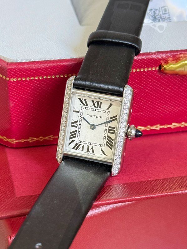 A classic piece from the iconic Tank collection, the timepiece features a 29.5×22 mm steel square case, a silvered white dial, Roman numeral hour markers and blued steel sword-shaped hands, exuding timeless vintage elegance.